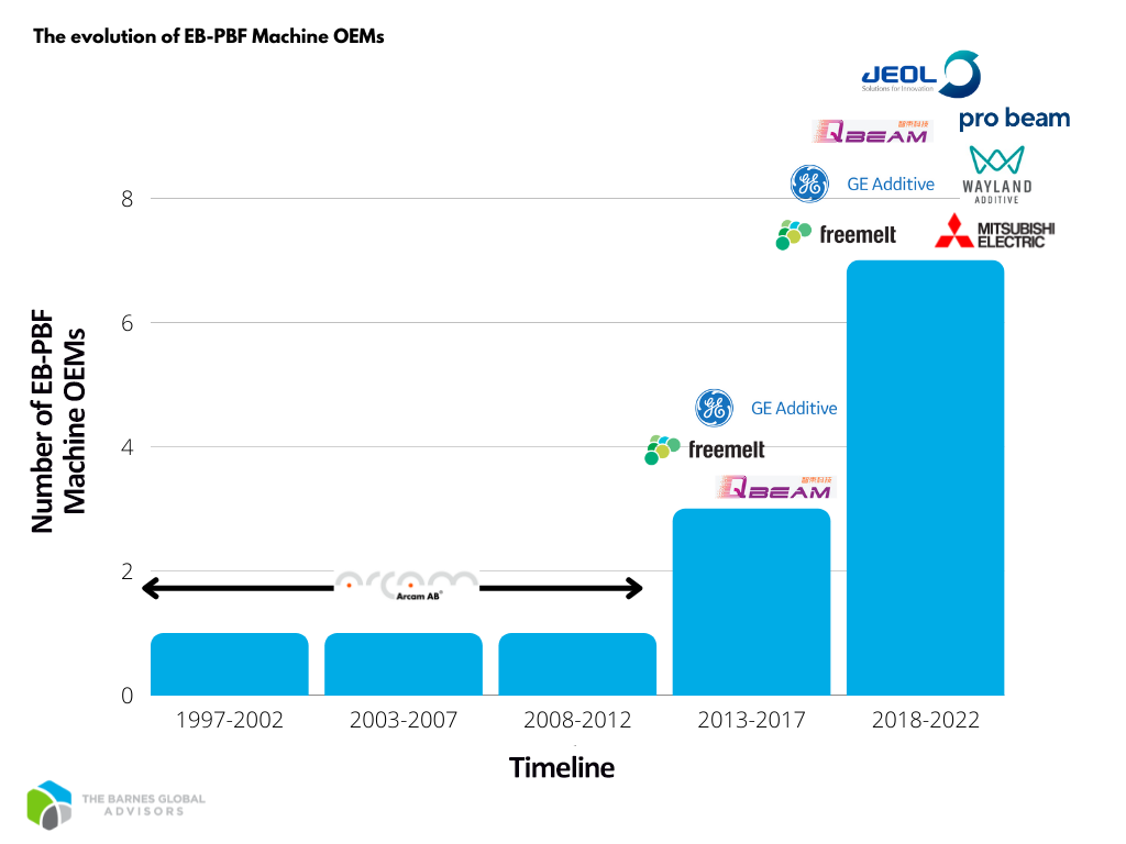 A look at how EB-PBF evolved in terms of machine OEMs over time (Figure 1) reveals two telling observations.