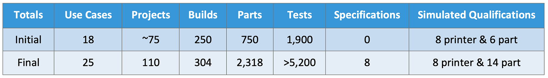What I am most proud of is that the team, and this includes the suppliers, exceeded every one of our promises to the Army, in some cases tripling them. The table below shows our hardware testing, and output metrics. This is across 7 different material and process combinations, with most of the use cases being metal. Note that since AMNOW was an S&T program with no engineering or procurement authority, our qualifications were simulated in which we performed all the same activities and analyzed the results against specifications, but we could not actually qualify anything, hence the term simulated. These still achieved the purpose of the program which was to demonstrate ability of AM technology and the supply chain to meet requirements.
